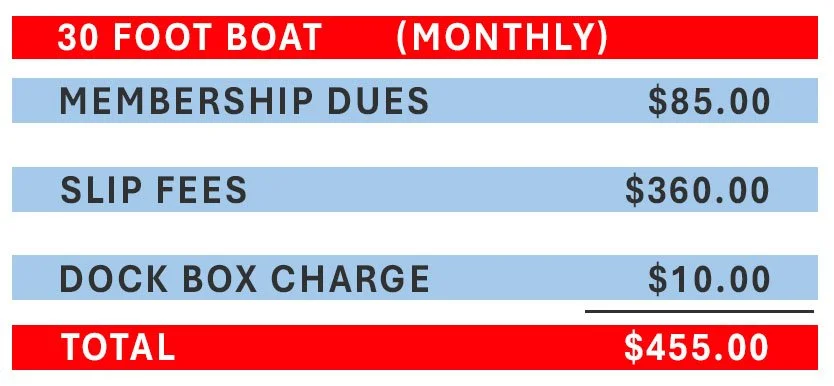 You must be a member of the club to berth a boat in our harbor. Monthly membership dues are $85.00 per month. When you apply for membership the 1st three months are due upon application. Slip fees are the greater of $12.00 per foot of dock or $12.00 per foot of vessel overall length. Going forward, membership dues and berthing fees are due on the first of each month. By way of example, assume you have a 30-foot boat, your monthly expenses, not including insurance, taxes, or other personal expenses like drinks and meals at the club. As with any business, we from time to time need to adjust our fees.